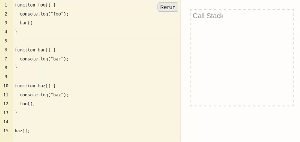 قبل از اجرای یک برنامهٔ جاوااسکریپتی، Call Stack یک محفظهٔ خالی هست. هر تابع به محض اینکه اجرا میشه توی Stack قرار میگیره و زمانی که اجرای اون تموم شد از Stack خارج میشه. تصویر زیر یک نمونه از نحوهٔ کارکرد Call Stack هست: