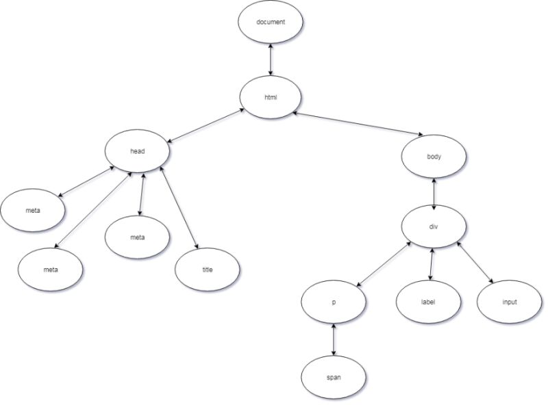 <!DOCTYPE html> <html lang="en"> <head> <meta charset="UTF-8"> <meta name="viewport" content="width=device-width, initial-scale=1.0"> <meta http-equiv="X-UA-Compatible" content="ie=edge"> <title>Document Object Model</title> </head> <body> <div> <p> <span></span> </p> <label></label> <input> </div> </body> </html>