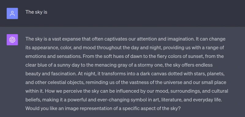 همونطور که میبینیم به ChatGPT صرفاً گفتیم «The sky is» و اون براساس دانش و فرضیات خودش چنین پاسخی داد. اما این پاسخ مد نظر ما نبود. برای مثال ما میخواستیم پاسخی کوتاهتر و توی یک جمله داشته باشیم. اینجاست که مهارت Prompt Engineering به کارمون میاد. کافیه Prompt رو کمی بهبود بدیم:
