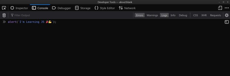 <!DOCTYPE html> <html> <head> <meta charset="UTF-8"> <title>Learning JS! 💪</title> </head> <body> <script> alert(`I'm Learning JS 🎉💪`); </script> </body> </html>